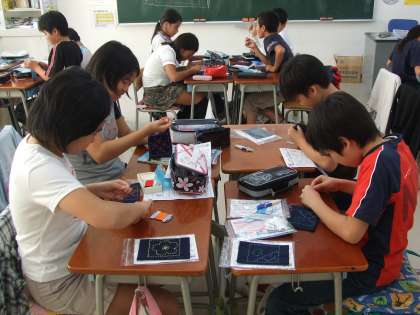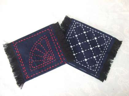 展覧会に向けて、5年生は1学期に藍木綿のコースターに刺し子糸で刺しゅうをしました。今日はその仕上げとして、コースターのふちを刺し子でステッチして、両端にふさを作りました。これで完成です!玉結び・玉どめ・なみ縫いなど、針と刺し子糸を使って奮闘しながら作りました。展覧会でぜひご覧ください。