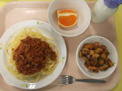 献立 ミートソーススパゲティ 青のりポテト 清見オレンジ 牛乳