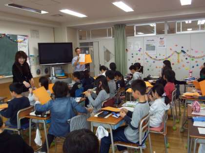 今日は英語支援員の先生がいらっしゃいました。5,6年生の先生といっしょに授業を進めていきます。子どもたちと一緒にあいさつをしていた一野教諭の感想「英語でのあいさつは、恥ずかしさを忘れさせてくれるので、楽しいですね。」まずは、英語が楽しい!と思ってくれるとよいです。