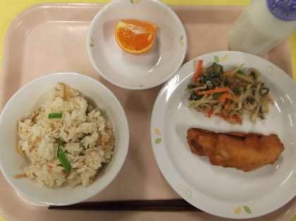 献立 筍ご飯 さめのフリッター 野菜のごまずかけ くだもの(紅小夏)牛乳