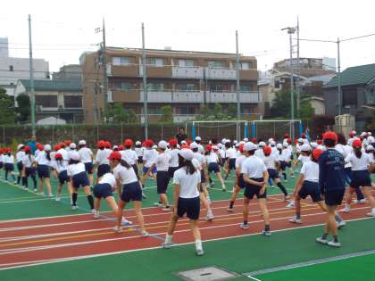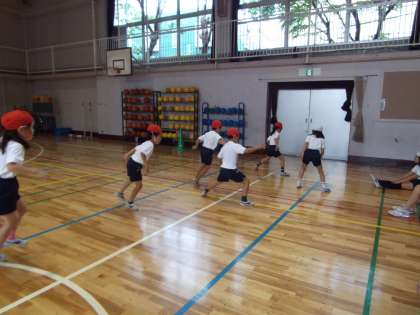 5月に入りました。明け方まで残っていた雨も、子どもたちが登校するころにはすっかりあがり、気温も急上昇!全校で準備体操を行い、クラスごとに各種目に散らばりました。6年生は1年生の、5年生は2年生のお手伝いをしながら、力いっぱい頑張っていました。下の写真は、準備体操、握力、反復横とびです。