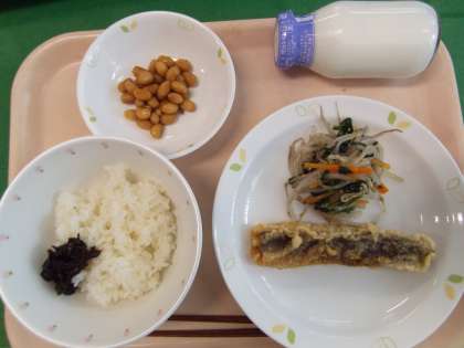 献立 ごはん のりのつくだに ぶどうまめ ほっけのいそべあげ しおナムル 牛乳