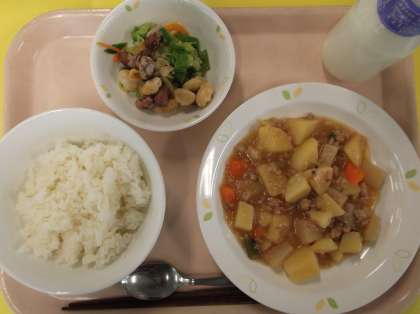 献立 ごはん じゃが芋のそぼろ煮 茹で野菜と豆のサラダ 牛乳