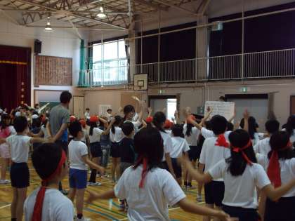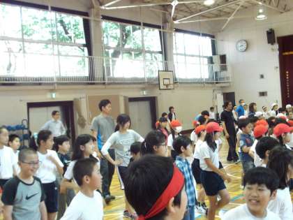 中里小の運動会といえば、中里音頭!運動会の歌に続いて中里音頭の練習もしました。先生たちも踊って盛り上げます。