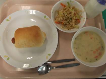 献立 ウインナーロールパン コーンポタージュ もやしサラダ 牛乳