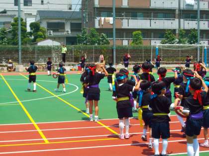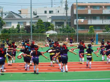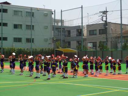 1,2年生の表現は「エイサー」。黒のTシャツに身を包み、きらっとひかる鉢巻きなど衣装も凝っています。それぞれ小さい太鼓を手に持ちながら力いっぱい踊る姿に感動します。1年生もたくましくなりました!