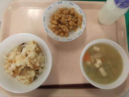 献立 かやくご飯 冬瓜のスープ 大豆とじゃこの甘辛煮 牛乳