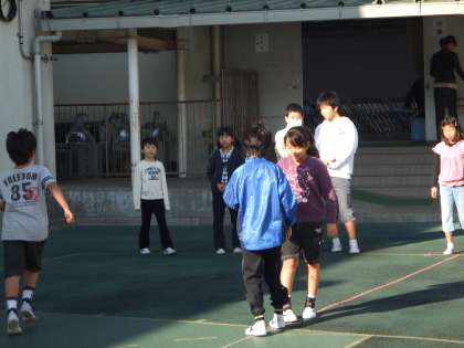 長なわ・だるまさんがころんだ・ドンじゃんけん・ハンカチ落としなど、たてわり班の班長さんが計画した遊びを、土校庭・小校庭・ワークスペース・旧BOP室・教室に分かれて楽しみました。6年生のお姉さんが1年生にやさしく教えてあげながら長なわを跳ぶ姿や、低学年と高学年の子どもたちが夢中になってドンじゃんけんをする姿がたくさん見られました。