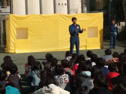11月の避難訓練では、火災発生を想定して、煙にまかれずに安全に避難する方法を体験しました。地域防災課の方から、「片手で壁を触りながら避難する」「低い体勢で、ハンカチなどで口を押させて避難する」など、煙の中での避難の仕方について教えていただきました。