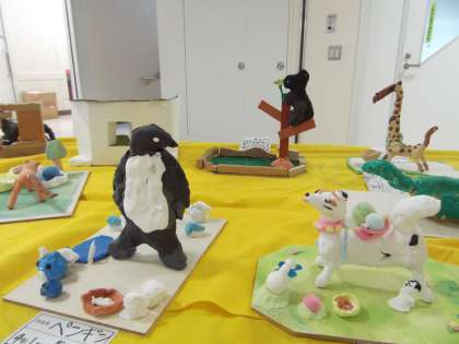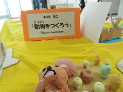 また、会議室前には4年生の図工の作品が飾られました。かわいい動物たちの立体作品です。是非足を運んでみてください。先日紹介した2階の3年生の作品も、まだ展示されていますので、合わせてご覧ください。