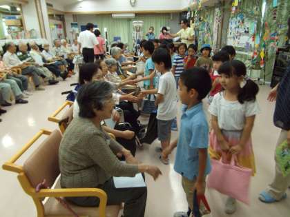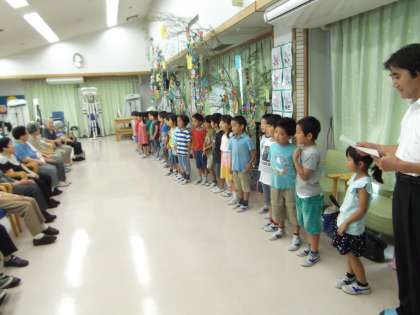 1年生が、七夕の笹をもって地域のお年寄りの施設を訪問しました。かわいい1年生ということ、施設の方々から大歓迎をうけました。どうもありがとうございました!