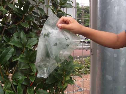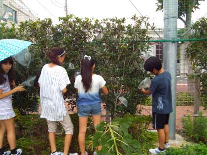 小雨が降りしきる中、6年生は植物の蒸散の実験をしました。葉っぱにビニル袋をかぶせて、葉から水が出ているか・・・
