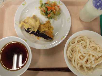 献立 つけめん 天ぷら(きす、なす、かぼちゃ) じゃこサラダ 牛乳