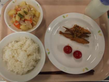献立 ご飯 ちかの南蛮漬け ミニトマト 塩肉じゃが 牛乳
