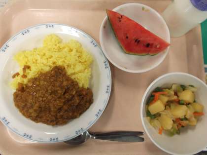 献立 キーマカレー じゃが芋のサラダ くだもの 牛乳
