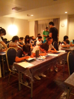 入浴、夕食を済ませ、日光彫りにチャレンジしました。先生のお手本に拍手が起こりました。