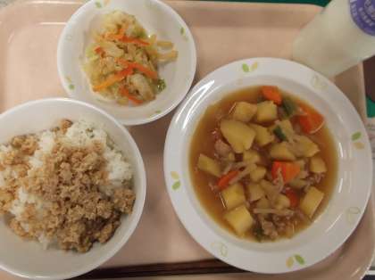 献立 ご飯 おからそぼろ 肉じゃが きゃべつのごまサラダ 牛乳