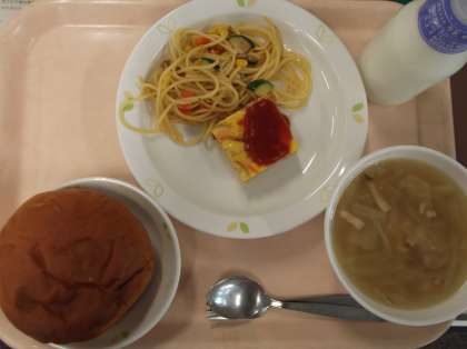 献立 黒糖パン スパニッシュオムレツ スパゲティソテー せんぎりやさいのスープ 牛乳
