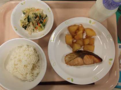 献立 ご飯 魚のみそ照り焼き じゃが芋の甘辛煮 じゃこサラダ 牛乳
