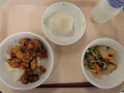 献立 しいらの揚げ煮丼 こんにゃくサラダ くだもの 牛乳