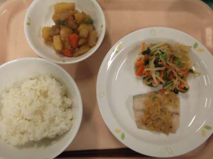 献立 ご飯 魚のねぎみそ焼き 野菜のごま酢あえ じゃが芋のそぼろ煮 牛乳