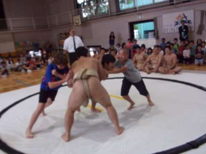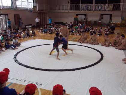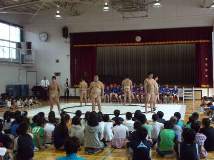 日本の伝統文化を体験してもらおうと都立足立新田高校の相撲部の方々をお呼びしました。体育館に土俵を設置し、バンバリーの子どもたちと中里の5,6年生の選抜チームで国際マッチをしました。また、相撲の歴史をお聞きしたり、みんなで四股を踏んだりしました。相撲部のみなさんは、各クラスに分かれて子どもたちと一緒に給食を食べました。ありがとうございました。