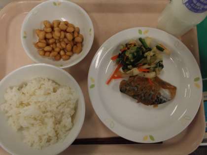 献立 ご飯 さばの味噌煮 白菜のぽん酢和え ぶどう豆 牛乳