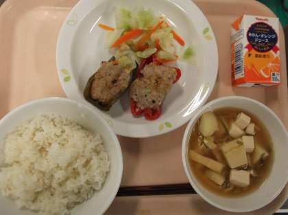 献立 ごはん ピーマンのにくづめ ひとしお野菜 みそ汁 オレンジジュース