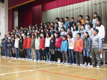 6年生はミュージカル「キャッツ」より、「スキンブル・シャンクス」と「メモリー」の2曲を歌いました。それぞれの曲想が伝わる歌い方を考え、聴く人にとどくように心をこめて歌いました。