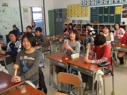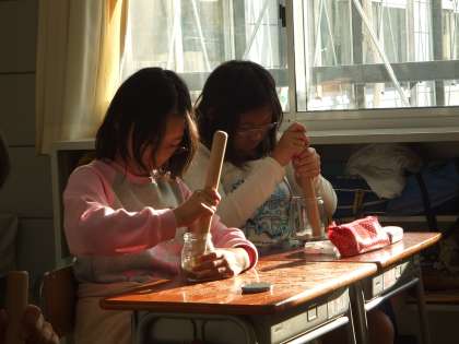 バケツ稲で収穫し、もみ殻をとった玄米を精米しました。玄米をビンに入れて、太めの棒を使って繰り返しつきました。何度もついていくうちに、たくさんの粉(ぬか)が出てきました。ふるいにかけて落としながら、少し白い色のお米に近づきました。