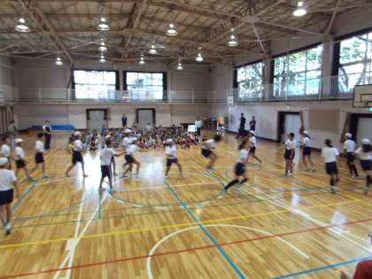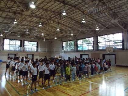 今朝の全校朝会は、明日に迫った連合運動会の激励会になりました。6年生は、下学年の子たちの前で、5分間の長縄に挑戦しました。心ひとつに、力を出し切ってほしいと思います。
