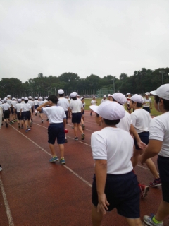 六年生が、世田谷区連合陸上大会で、頑張っています。雨も吹き飛ばすくらいの熱気で、べストを尽くして記録への挑戦です。