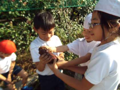 校庭の東側にある学級園で、2年生がイモ掘りをしました。子どもたちは、「先生ーみてみて大きいよ!」や「こんなにちっちゃい!!」と歓声をあげながらイモ掘りを楽しみました。さて、このおイモたちは・・・
