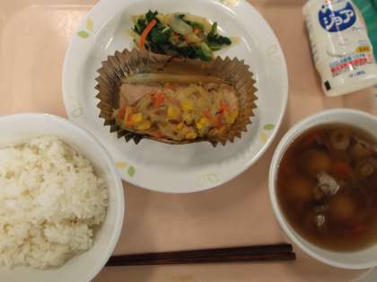 献立 ごはん 鮭のちゃんちゃん焼き 芋団子汁 白菜のぽん酢和え ジョア