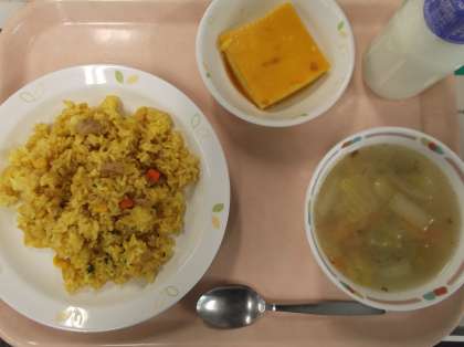 献立 カレーピラフ 白菜のスープ かぼちゃプリン 牛乳