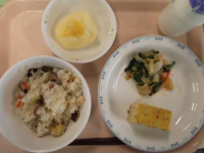 献立 吹き寄せごはん しらすの卵焼き 白菜のぽん酢和え りんご 牛乳