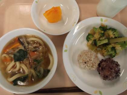 献立 五目うどん しんじゅむし ブロッコリーのごまじょうゆ 柿 牛乳