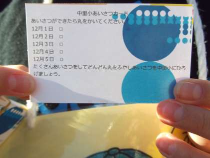 今回のあいさつ週間は、運営委員会の発案で地域の方にもあいさつをしています。あいさつだけでなく、名刺大のカードを配布して、中里の取り組みを発信しています!みなさん、ご協力おねがいします。