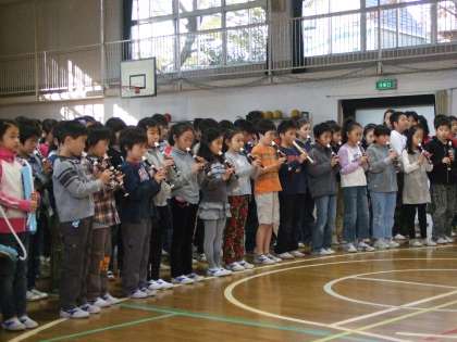 そして今月の歌「ありがとう」。校長先生のお話の後、みんなの心と心をつなぐこの言葉をかみしめながら、心をこめて歌い声を体育館にひびかせました。