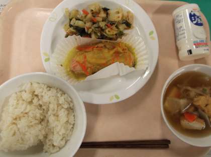 献立 きびご飯 鮭のマヨネーズ焼き きゃべつのおかか和え いなか汁 牛乳