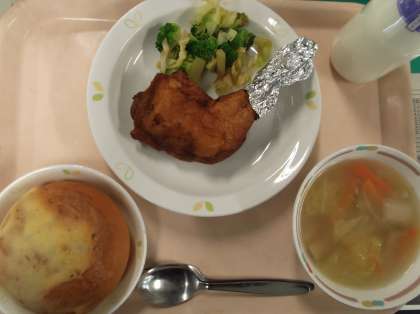 献立 ビスキュイパン クリスマスチキン ブロッコリーのからしじょうゆ 白菜のスープ 牛乳