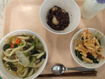 献立 七草肉うどん カリカリ油揚げのサラダ 白玉おしるこ 牛乳