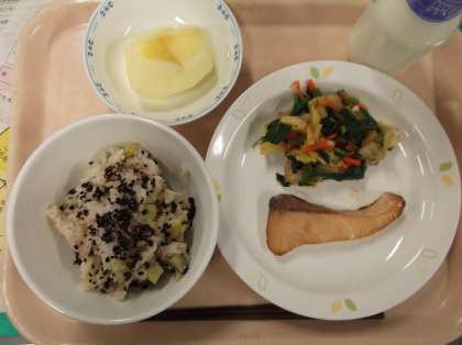 献立 小豆ご飯 ぶりの照り焼き 白菜のぽん酢あえ りんご 牛乳