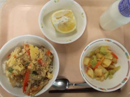 献立 親子丼 じゃが芋のサラダ くだもの(はるか) 牛乳