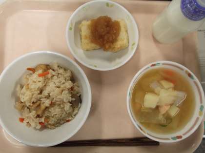献立 帆立の炊きこみご飯 石狩汁 揚げ出し豆腐 牛乳