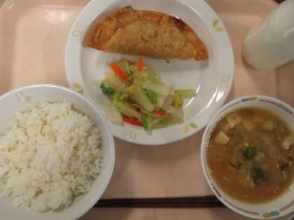 献立 ごはん ジャンボ餃子 白菜の中華サラダ マーボースープ 牛乳