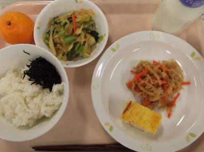 献立 ごはん ひじきふりかけ 卵焼き 寒天サラダ 切干大根の煮物 ぽんかん 牛乳