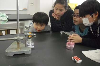4年生がアルコールランプを使って理科の実験をしました。もののあたたまり方を調べました。まずは、マッチを擦って、アルコールランプに火を付けるまでが緊張の連続でした。