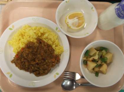 献立 キーマカレー じゃが芋のサラダ くだもの 牛乳