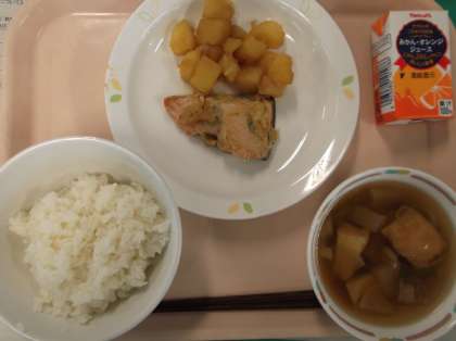 献立 ご飯 鮭のねぎみそ焼き 田舎汁 じゃが芋の甘辛煮 オレンジジュース